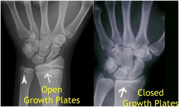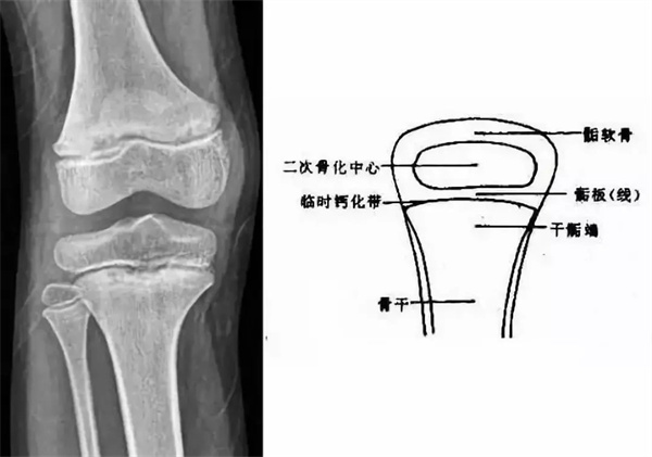 我們都知道,人體的高矮是由骨骼的生長發(fā)育決定的,特別是下肢長骨。長骨呈長管狀,在長骨的兩端有一種專管骨骼生長的骺軟骨,它與干骺端之間有一盤狀軟骨結構稱為骺板(線),在幼兒的X光片上表現(xiàn)為一條較寬的透光帶。(見下圖)
